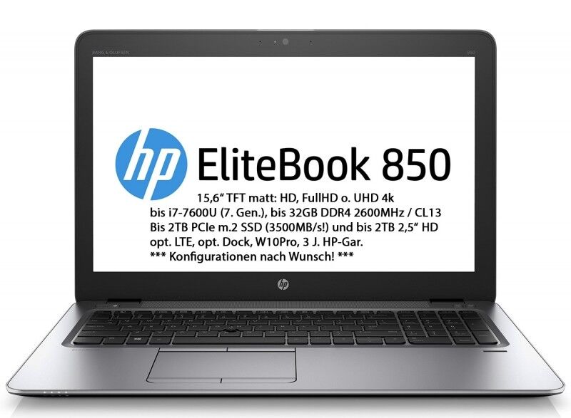 HP Elitebook 850 G4 Tiger2 15,6'' FHD i7-7500U 32GB 1000GB-SSD-m.2 + 1TB-HD HD620 Win10P/W7P 3J.Gar., CTO (spezif. Konfiguration mit 32GB Ram und 1000GB SSD m.2 + 1TB Festplatte, ohne LTE, die Konfigur. wird extra für Sie gefertigt, Konfigur.-Bedarf einige Werktage), HP Elitebook 850 G4 15,6'' Business-Notebook, edel & robust, military standard MIL-810, Gewicht ab ca. 1,8kg, Maße 38 x 25,7 x 1,9cm |